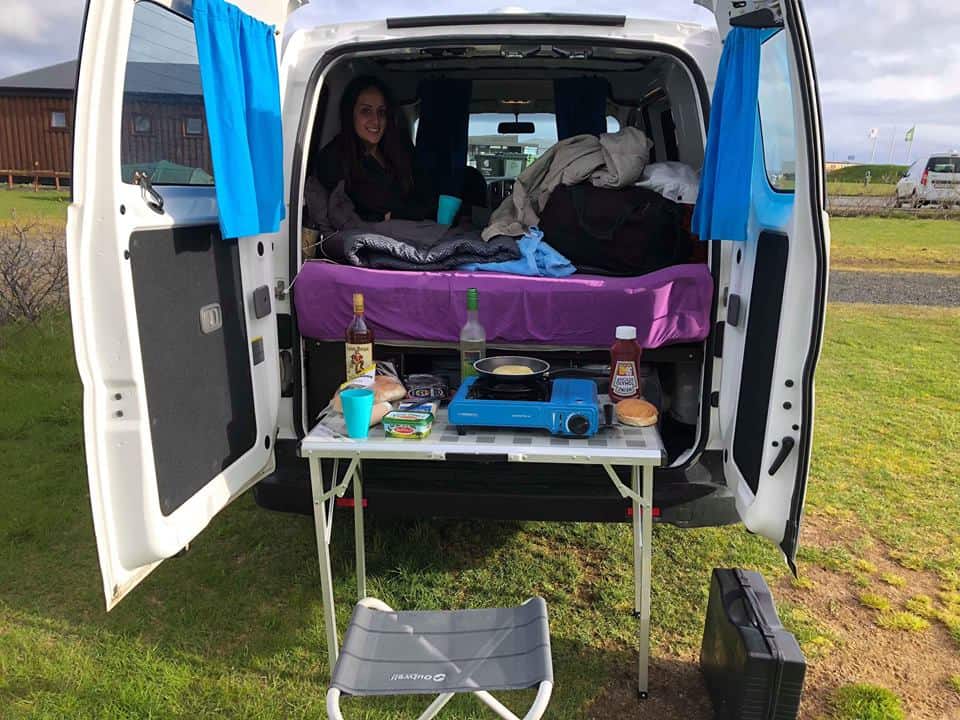 We arrived at Keflavik Airport in the late afternoon and soon after landing we picked up our van. We chose the Renault Kangoo camper van, which is perfect for two people. Being from what is known as the “Sunshine State” in Australia we are used to hot, mildly hot and very hot weather so it made me shiver just thinking it would get down to four degrees at night. But I needn’t fear because the van had a crazy warm heater that kept us warm whenever we had the van parked. It also came with a stove, table and chairs, cutlery, the comfiest bed we have slept in overseas and WiFi. So basically, everything you need.