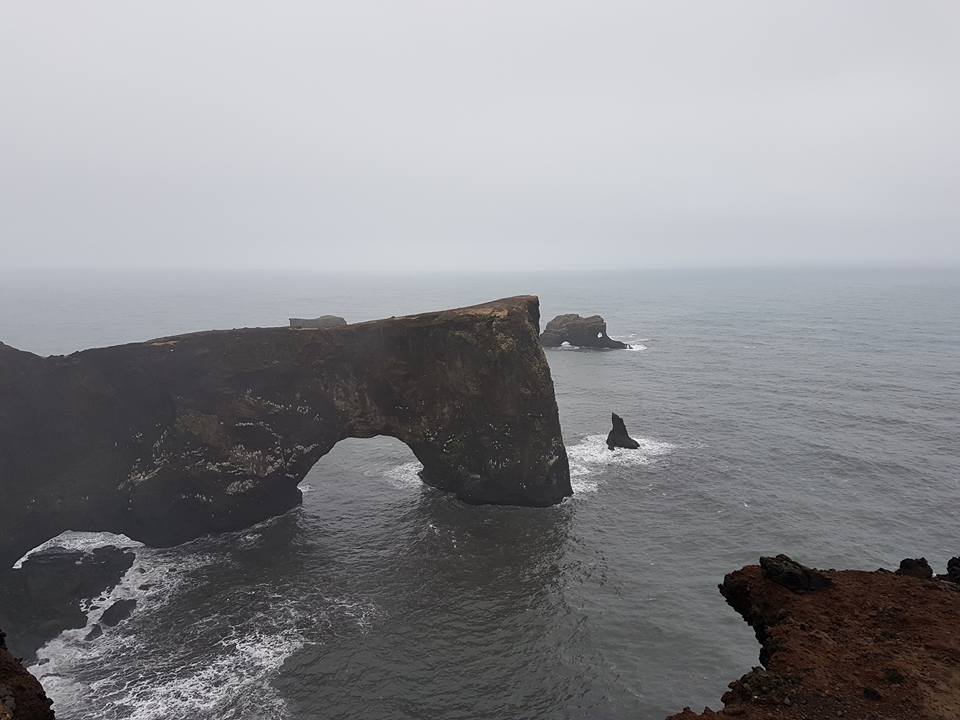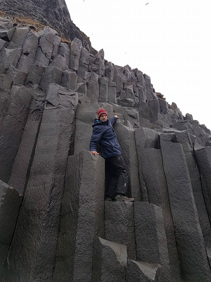The walk back was also very long, but we were excited to see the arch and black sand beach at Dýrhólaey!!! This place was absolutely stunning! The lava looked like it was sculpted by someone, and the massive black beach was jaw dropping. We took a lot of great pictures, and I couldn’t resist climbing the basalt columns! We liked that place so much we decided to camp nearby next to a cave said to have been used by Vikings in local gatherings.