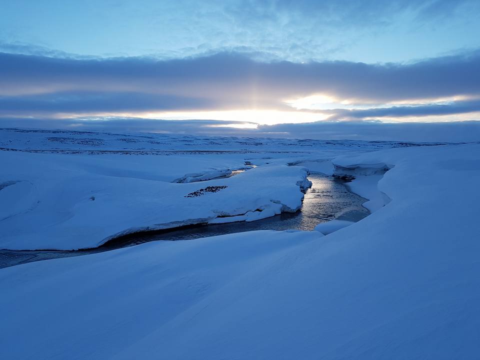The town was very pretty and it felt quite claustrophobic to be surrounded by high mountains on 3 sides and the sea on the fourth! Now I know why all the locals have 4x4s! We then drove back across and headed West across snowy landscapes towards lake Mývatn. The arctic surroundings were so beautiful we decided to camp here for the night, at junction between route 1 and 85. There was even a stream from which we topped up all our water from. This water stayed cold for the rest of the trip!