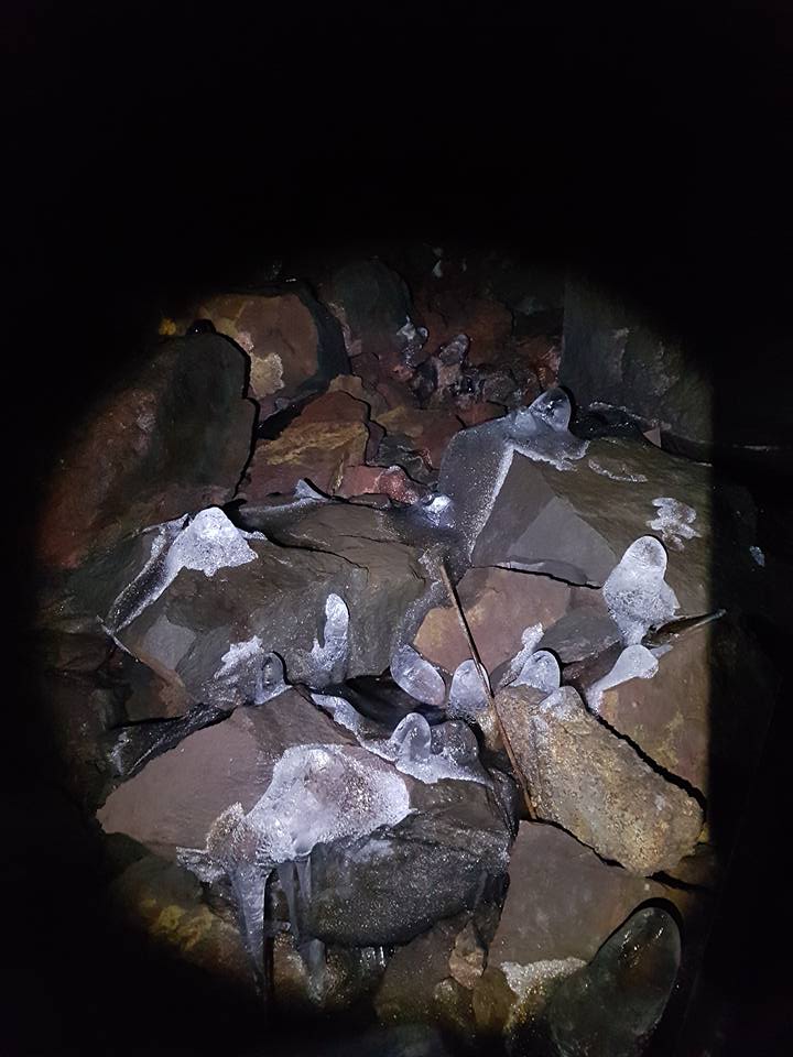 The temptation was too great so we decided to take a peek inside. The footing was very icy and treacherous but what we saw was amazing. Ice had formed beautiful small statues on the rocks and on the sides of the wall the remnants of old lava can clearly be seen! Happy with what we saw, we went back out, cooked a nice fish soup and went to bed ready for day 3!