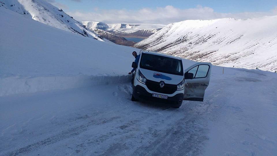 By lunchtime we had crossed the snowy landscapes and reached the lake Mývatn area. We started of by seeing the Hverir geothermal zone and climbed the ridge to have an amazing 360 degree view of the surroundings. It really felt like we were on top of the world, even though the ridge wasn’t actually that high! We were also interested in visiting the geothermal powerplant across the road but it’s only open to visitors in the summer months, so we decided to hike up to see some craters around there.