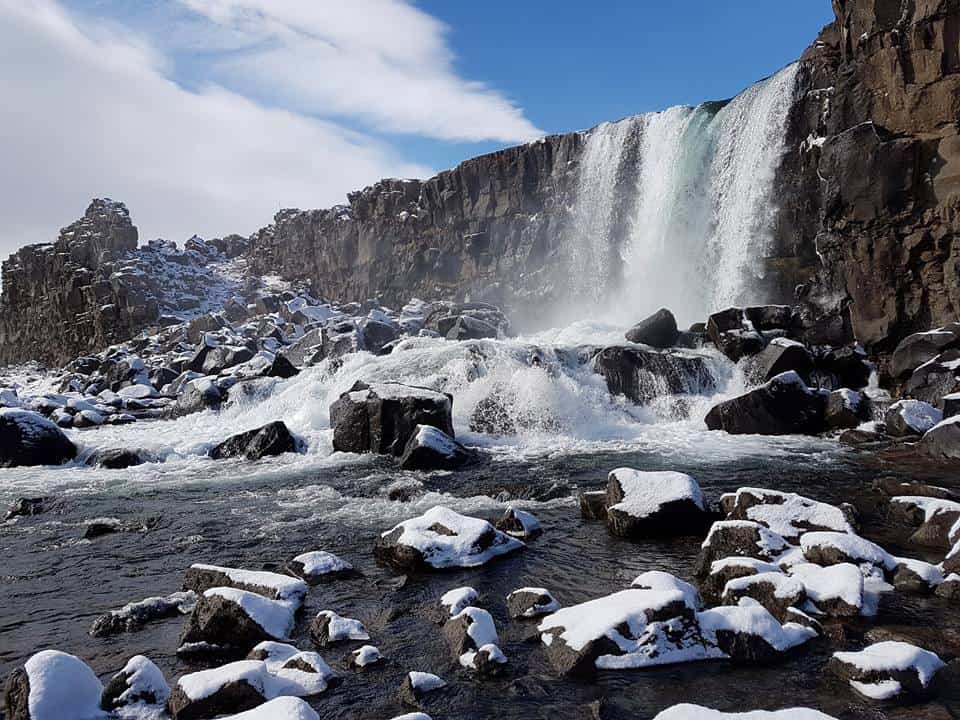 We woke up extremely excited, as this was the day we would snorkel in Silfra! But I’m getting ahead of myself…the day actually started with us seeing the inside of Hallgrímskirkja. We then went to Café Loki just opposite for a hot chocolate and to try out the famous dried fish with butter, which was delicious! We then headed straight for Silfra, stopping to take the occasional photo of the fantastic scenery. We had some time to spare, so we made the small hike to Öxarárfoss. It is definitely worth seeing as the picture below shows! Time to now go and see what the water is hiding underneath! (no pun intended)