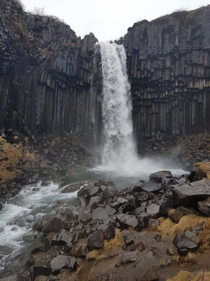 This is another day we were mega excited about! We would both be seeing icebergs and glaciers for the very first time in our lives. Not before Callum dropped his camera lens in the van! We rummaged around the van for a long time but it was as if an invisible vacuum cleaner had sucked it up! Not to worry, it will appear again on a later date, but for now at least he had a spare. On the way to the glacier lagoon we briefly stopped to see Systrafoss and Foss á Siðu, along with the basalt “church floor”.