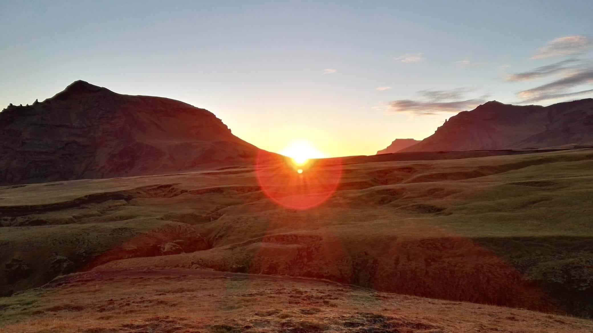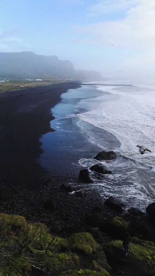 When we woke up on Day 2, we took our first “smelly egg shower”. The good news was that the water was hot, which was really appreciated on that 3-degree morning. The temperature variation is quite big in September. We hit the road again and visited a couple of nice “foss”. We stopped on the road to enjoy a quick lunch in good company. The Icelandic horses we really curious about our meal! This is another great thing about campers: you can stop wherever you like and prepare your lunch. We went for a long trek at Skógafoss. We were trying to reach sheep that seemed not so far away but we ended up spending 2 to 3 hours walking. Everything is so big in Iceland that you really lose your points of reference. You look at a point and think it’s going to take you about 20 minutes to get there and finally it takes you an hour and a half. But anyway, this walk was worth it. It was just so beautiful. We watch the sunset at the top with a sea view on one side and the volcano on the other. It was really a magic moment. We then drove all the way to Vik and spent the night there.