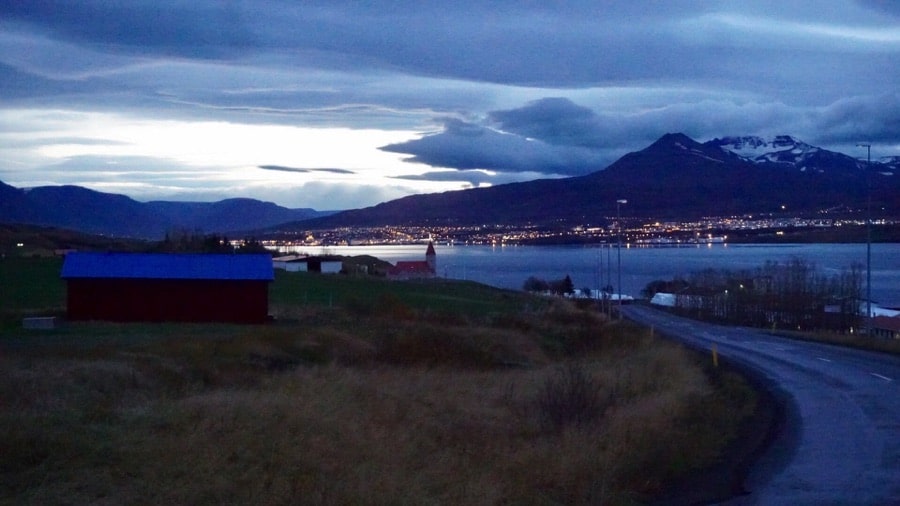 In only another hour on the road the two descended into the valley of Akureyri. The water in the bay reflected the city back at itself, but upside down. The full color carbon copy of the town reflected an abstract impression of this modern skyline up towards the sky.