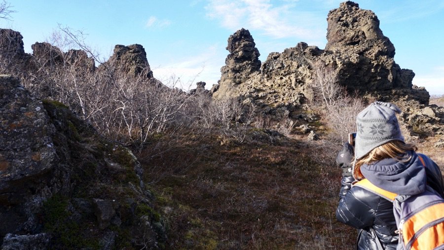 The route to MýVatn was surreal. At this elevation, it seemed as if nothing lived. The herds of wild horses and sheep they’d previously seen along their route were nowhere to be found. Clouds formed concentric, puffy spheres above this high desert region and the landscape was bespeckled with odd-shaped volcanic droppings of otherworldly formations. One would not want to break down here. It was miles from any help. But that didn’t stop the girls from pulling over for some roadside photos. The amorphously shaped scenes were too much for these amateur photographers to pass up, so they stopped for a few snapshots.