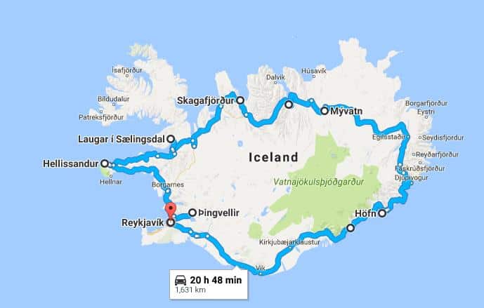Heading North and West from Reykjavik, Debrania took the counter-clockwise route around the country in hopes that they’d make it to Fosshotel Vatnajökull by happy hour that day. Here is the pic of their Google-map of their Ring Road adventure.