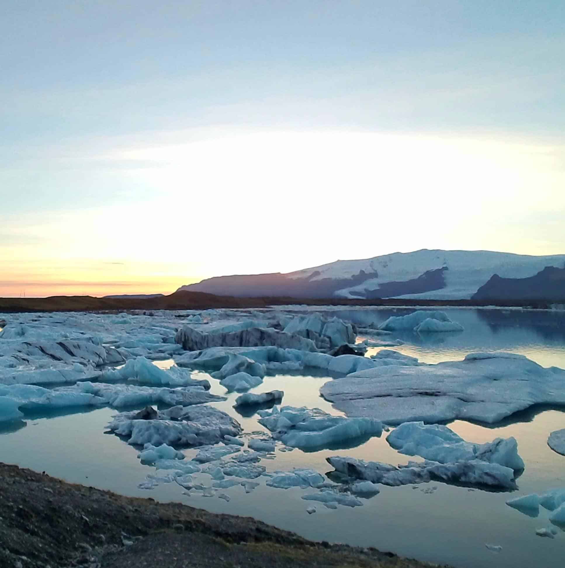 The lush lagoon was loaded with hues of reflective blues and glassy whites, reminiscent of those summertime popsicles of DebraNia’s youth. They paused with a sigh before climbing up the slight hill to take in the view of the majestic growlers from above the lagoon. Sunset arrived and it couldn’t have illuminated the Glacial Lagoon more beautifully. Just as they were about to leave, a large chunk of glacier calved from a sizable ice mound and hit the water with a voluminous splash. The sound silenced the girls with its echoes of epochs gone by. They paused to watch the newly formed ice raft float toward its warm-ocean demise.