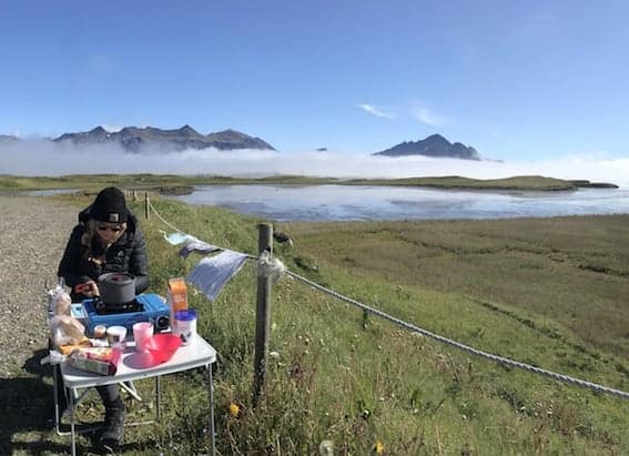 After all the rain and 3 days of grey Icelandic sky, we woke up at the camping site in Höfn and couldn’t believe our eyes: pure sunshine and a magical view of beautiful clouds that separated the mountains and the ocean. That view called for an extra long breakfast 🙂