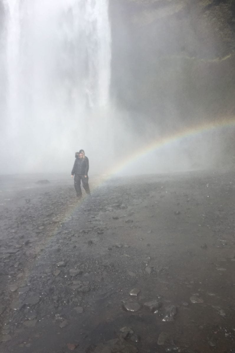 Later at waterfall Skógafoss we walked all the way up to watch the gigantic water masses falling down as well, which is even more fun, we put on all our waterproof equipment and went as close as possible to where the water is falling on the ground and were literally standing in a rainbow – a feeling of being more than alive!