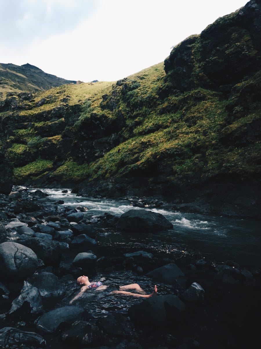 One of our favorite memories of the trip began when we were sitting in a little café charging our equipment just outside of Vik. We had overheard some people come in and ask directions for a “hidden pool”. Our ears perked up, anything with the words “hidden” and the promise of a warm pool excited us, especially after all the hiking we had done. We quickly googled and found the place they were talking about. On our way out we were stopped by two Americans who overheard us getting excited and told us that the hidden thermal pool was amazing but that if you walk further down there is a super hidden natural spring towards the mountain. We looked at each other and said, “let’s go.”