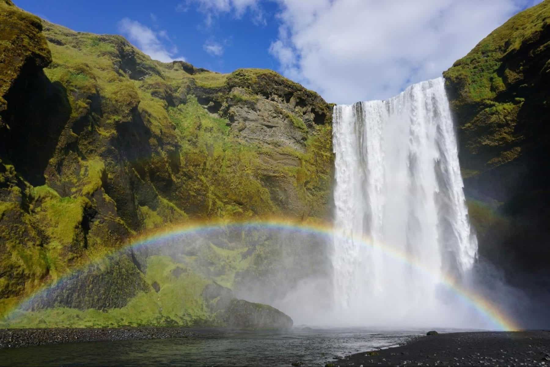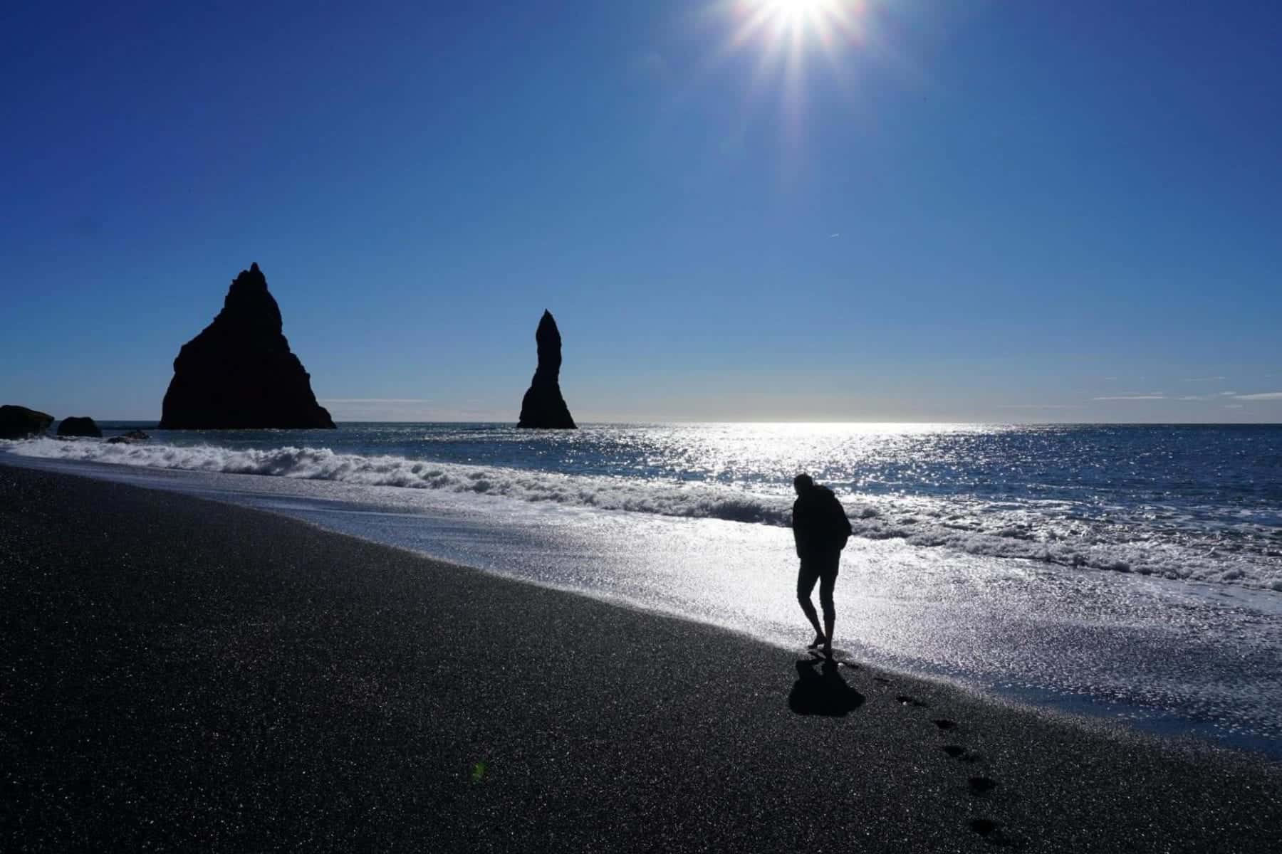 Main Activity: A walk on Reynisfjara Black Sand Beach and sun tanning on the basalt columns like seals and watch the permanent rainbow by Skógafoss