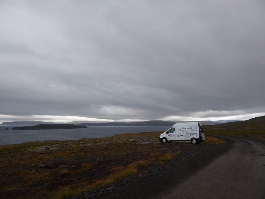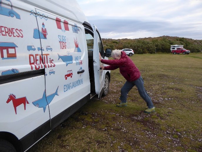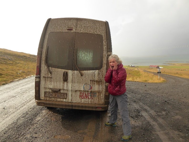 There’s a lovely walk to the lighthouse on Stykkishólmur, worth the climb. Back at the campground we gave Gudrid a good washing down – just caked with mud from wet roads.