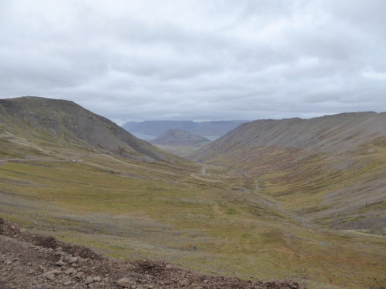 On to Ísafjörður by evening. Wow – this was an amazing drive along the south coast and up/down the cliffs of the fjords…like going up and down mountains with a dizzying grade (up to 14%), hairpin turns with no guardrails on dirt roads. Roads are hard-packed and well-maintained, though. Thank God Gudrid has good brakes and a strong engine! Ísafjörður had lovely little campground. There were trees, a waterfall and creek cascading and clean, warm bathrooms.