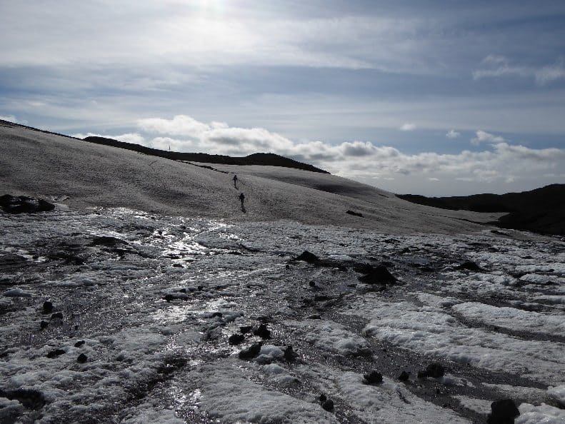 We set the alarm last night for every 2 hours to check for Aurora…no luck. Climbed the many stairs to the top of the waterfall, entered through a gate and hiked upward on the Fimmvörðuháls trail. The trail was spectacular with 20 or more waterfalls and misty canyons along the river for first 5 miles. Above the bridge it becomes a glacier covered, volcanic landscape when taking the red trail. Our loop was 18.75 miles but worth every step. We also felt very lucky to have such a beautiful, sunny day.