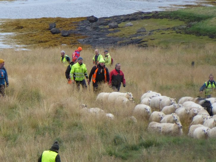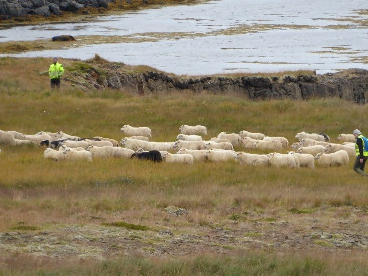 We really wanted experience a réttir (sheep round-up) where the local farmers bring in their sheep from the mountains and back to their farms for winter. We found a round-up quickly – quite a few farmers up on cliffs bringing sheep down steep embankments, many on the road with farmer’s cars and family waiting behind the sheep. I asked one of the hardy Icelandic women (!) if we could help and she said just follow, so we did – for several hours. This is hard work!! The sheep are very high on ridges and cliffs and would rather not come down. The terrain was extremely rough and the sheep very skittish. The herders spoke to each other from cliff tops using Walkie-talkies and wore bright orange vests to be easily seen. The sheep were finally corralled into one farm to be sorted and sent home to their respective farms. It was a great experience even if we weren’t much help.
