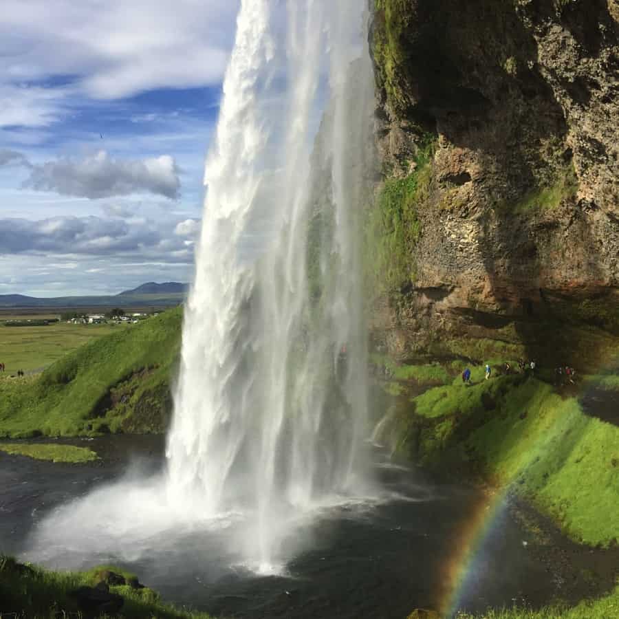 Finally, we stopped at Seljalandsfoss Waterfall, where we hiked all around and behind it. The waterfall was incredible – there was even a rainbow to top it all off. It looked like a picture from a post card!