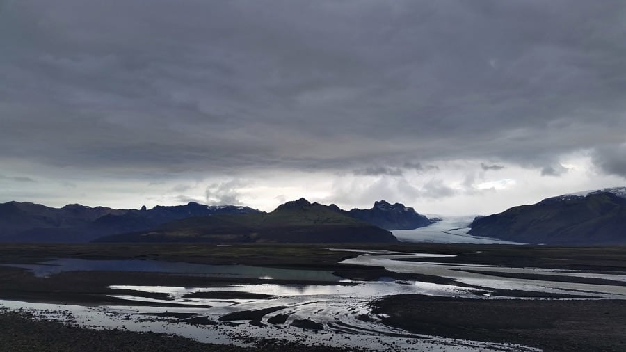 As the sun began to sink, we had our eyes peeled to find the perfect location to spend the second night away from campgrounds, on our own in the camper. We were thrilled to find a flat, secluded pull-off area near the base of Mýrdalsjöjull glacier, and we happily set up camp here for the night. Cooking on a camp stove while watching our first Icelandic sunset reflecting off of a glacier was simply incredible. We enjoyed some whiskey and wine (purchased from the duty free store at the airport, of course!) under the stars before calling it a night.