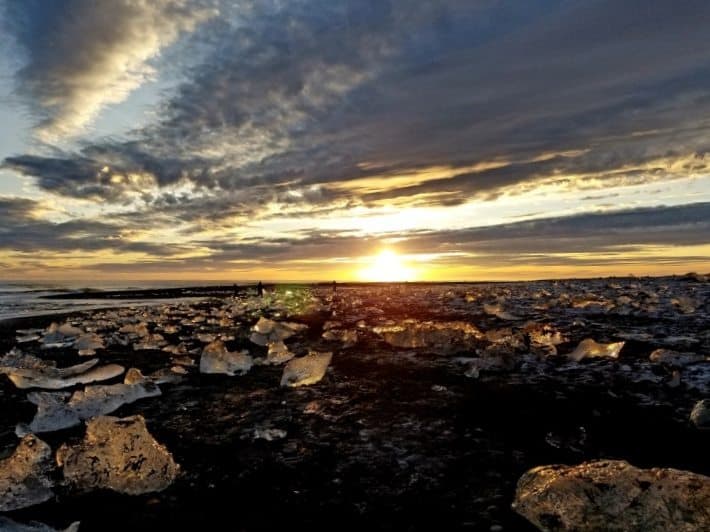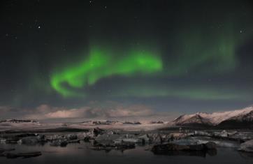 The rest of the sunlight hours were spent enjoying the seals and beautiful iceberg reflections of Jökulsárlón Glacier Lagoon, a sparkling golden hued Diamond Beach, and a twilight trip to Breiðárlón Lagoon where the sun and moon once again shared the same sky. An amazing day, which only got more exciting once darkness arrived.