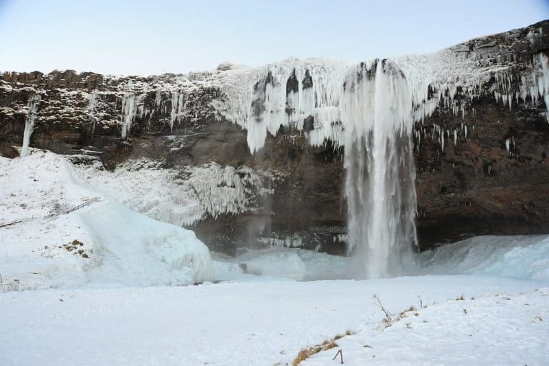 Stops at Geysir and Selfoss were brief. Unlike the summer, when hiking and exploration can be done at each stop, ice curtails winter sightseeing. We spent enough time at Geysir to witness two eruptions, and while Gullfoss was still thundering, its’ summer ferocity was dampened by wintry icicles. Stops at Skógafoss and Seljalandsfoss, left the same impression.
