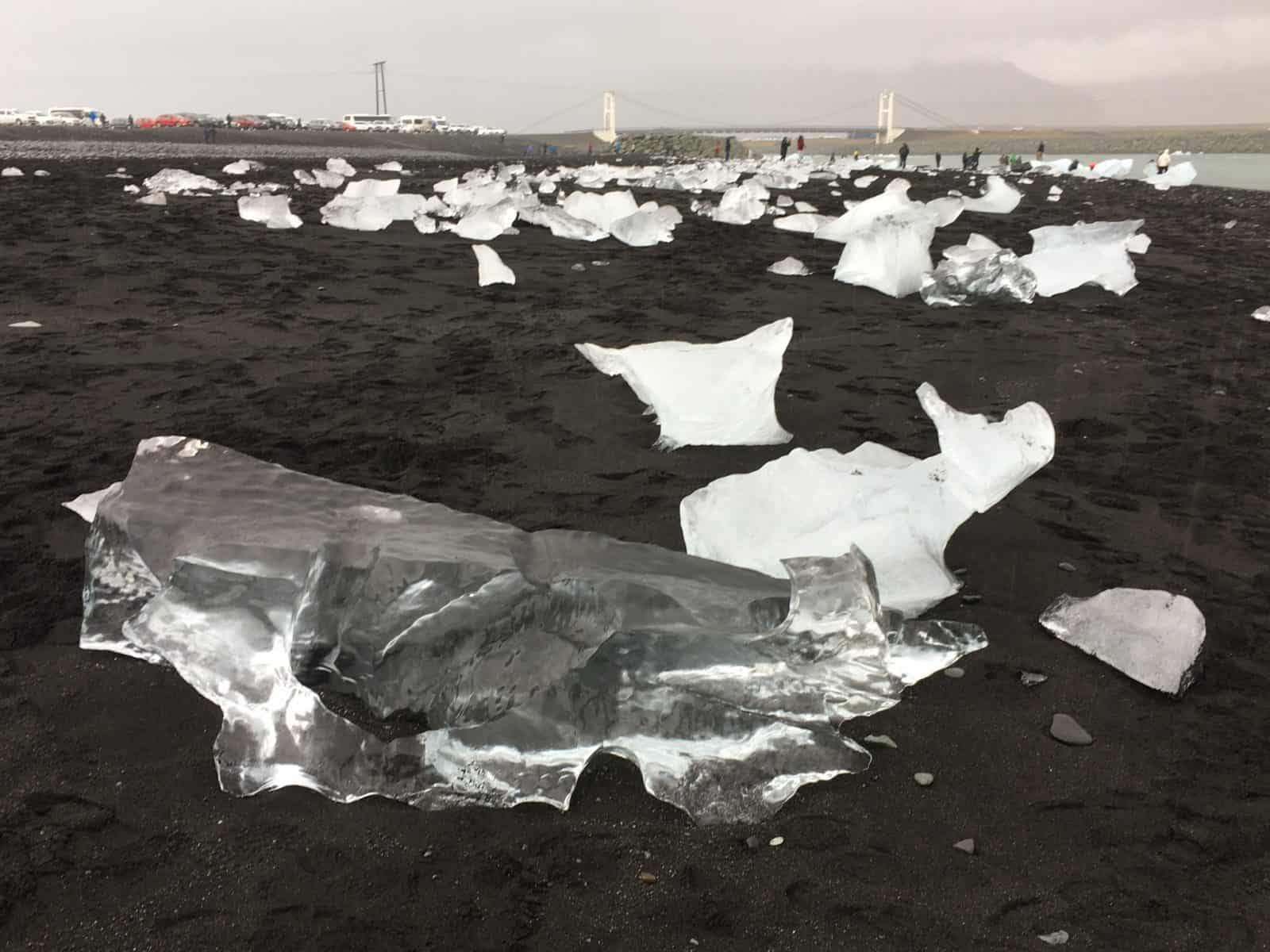 In the morning, as we approached Jökulsárlón, we noticed several cars and tour buses parked off the main road by the ocean. Curious, we turned and were shortly rewarded with the surreal sight of large chunks of glimmering ice from Jökulsárlón that had floated out to sea and were carried to the black sandy beach we now stood on, this area called Sveitarfélagið Hornafjörður.