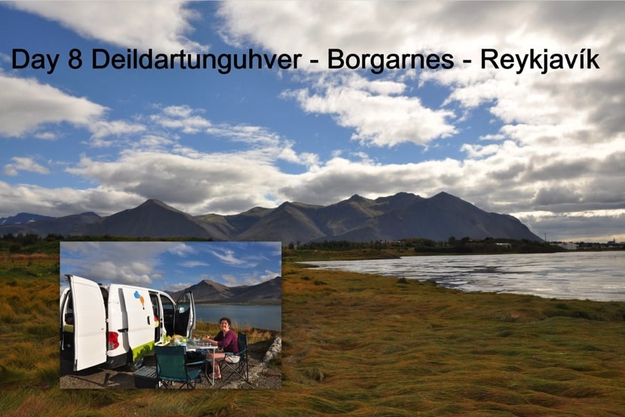Next stop was Borgarnes, a village at the south coast. We had the idea to go for a long walk and we already had a destination. It was a small chapel on the other side of the bay. Only problem was that there was only the street but no path and we didn’t want to walk next to the cars. So we decided to walk straight through the grassland and ended up in a paddock. It is not that easy to get out of there again. The only way was to clump through a muddy and boggy area, to jump over a small river and to crawl under an electric fence. After we succeeded in leaving the paddock we were so dirty and hungry that we didn’t want to go to the chapel anymore. We walked directly back to the car. The good thing was that afterwards we felt so warm that we then took out our hot pants. Only for 2 hours, but still we felt like on real summer holiday.