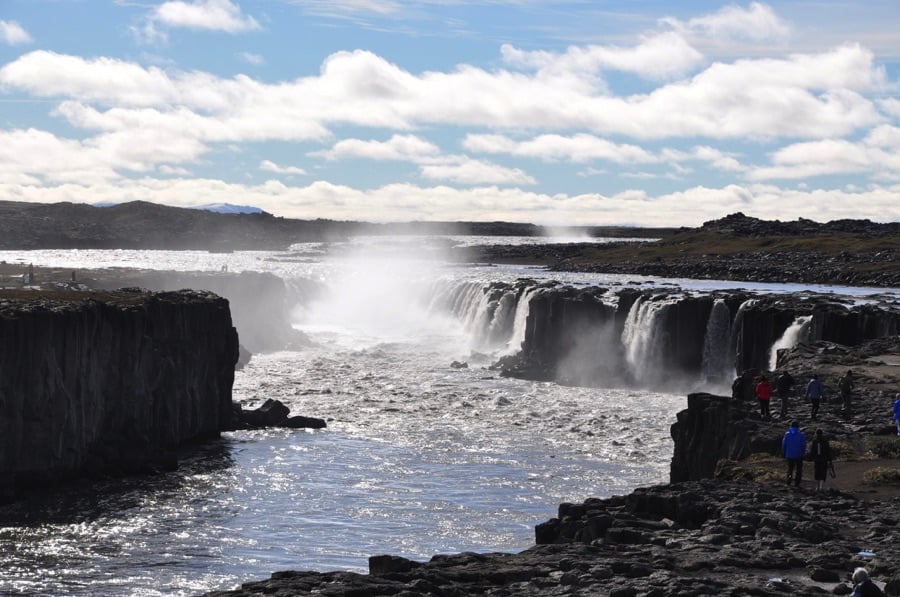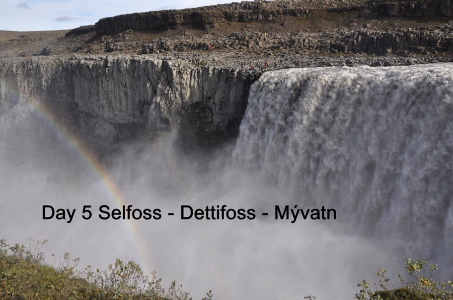 After a short time we reached Selfoss and Dettifoss. Both were very stunning. Dettifoss is the biggest waterfall in Iceland. We were amazed by the rainbow coming out of the gorge and all the water which looked more like cream because it was so rough. It´s hard to describe.